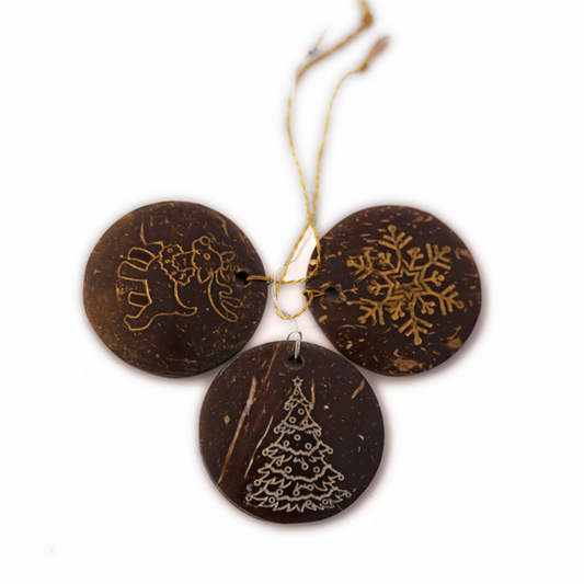 Coconut Shell Christmas Hangings Decorations - Set of 6 (2 Reindeer, 2 Tree, 2 Snowflake)